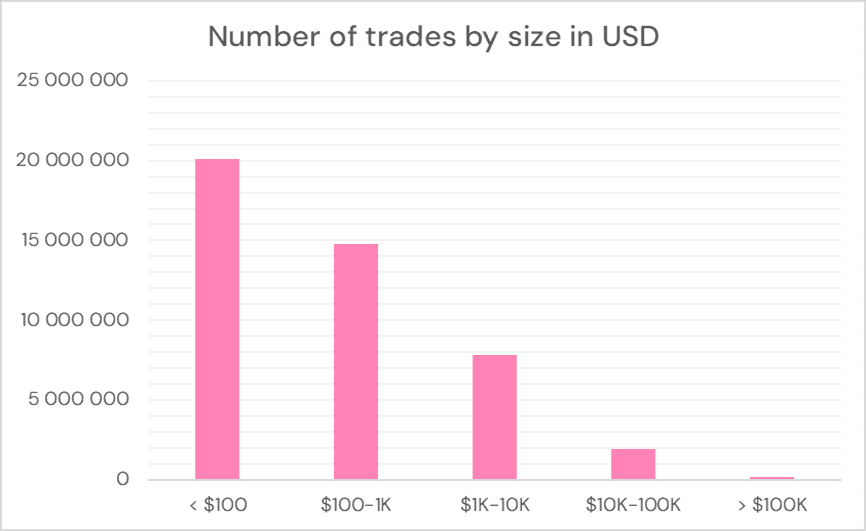 220x difference between average ($2,600) and median ($11.78) trade size — indicating significant whale activity. The distribution is heavily skewed by large trades. While half of all trades are under $12, a subset of high-value transactions pulls the average upward by over 220x. This pattern is typical of markets where both retail and institutional participants coexist.